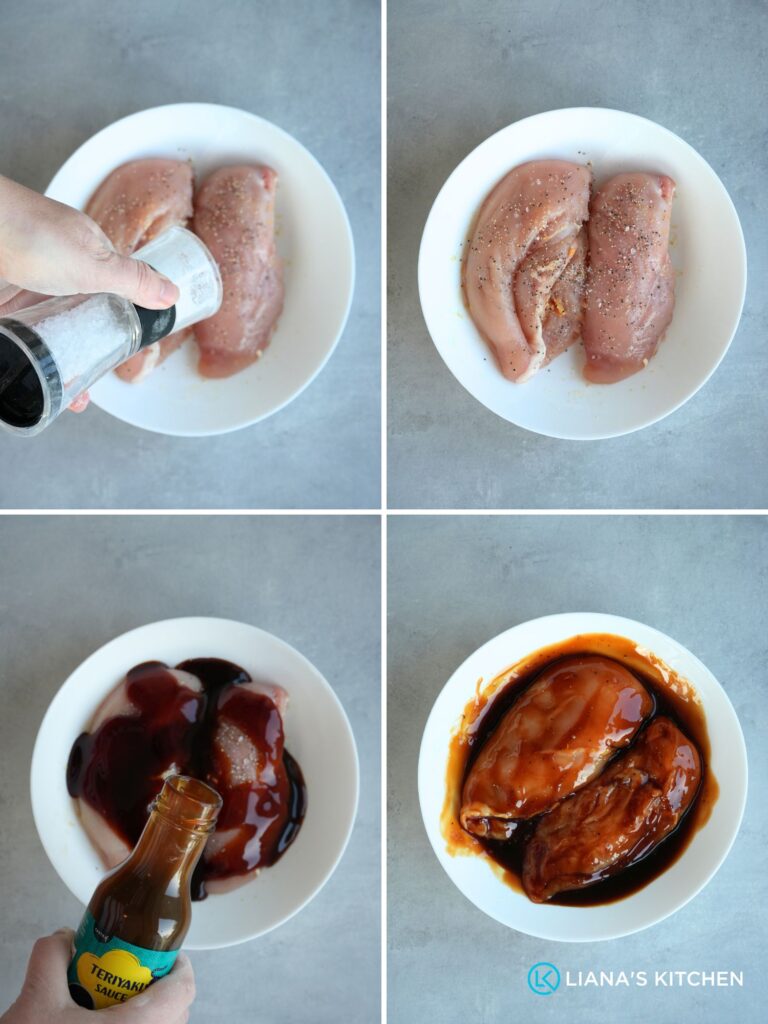 - Place the chicken in a bowl and pour about three quarters of the teriyaki sauce over the top. Turn the chicken so it is well coated.