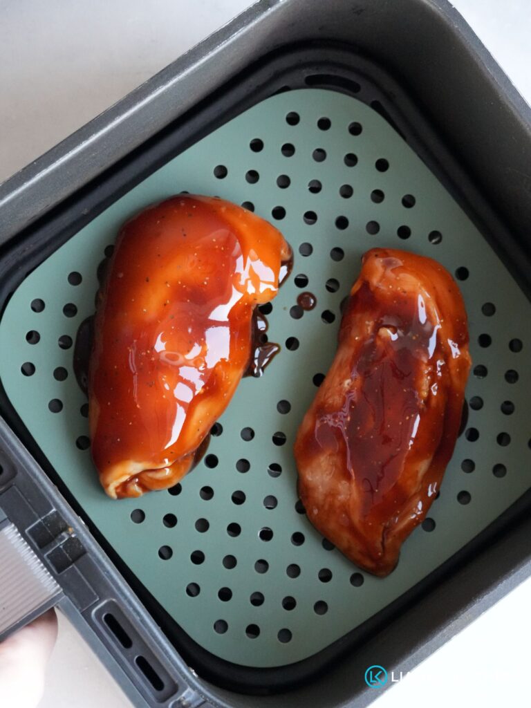 - Place the chicken in the air fryer basket and cook for 18 to 20 minutes at 180°C, turning halfway through. When turning the chicken, brush the remaining teriyaki sauce over the other side.