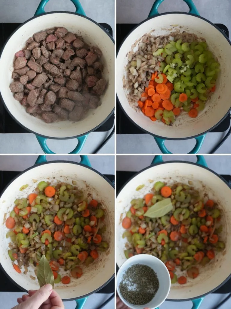 - In the same pan, add onions, garlic, carrots, and celery. Cook for 2–3 minutes, then stir in the flour and cook for another minute.