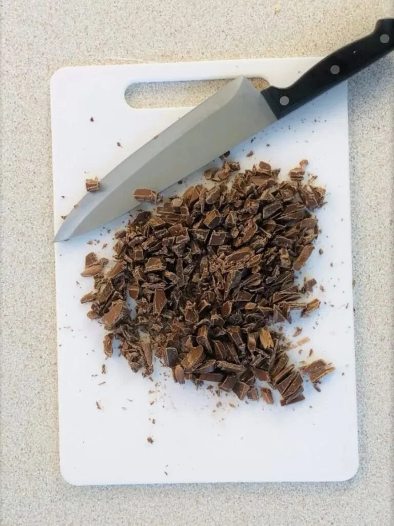 If you are using a bar of chocolate rather than chocolate chips you will need to chop them up. Be particularly careful when chopping up the chocolate – you will need to use a sharp knife to cut through it.