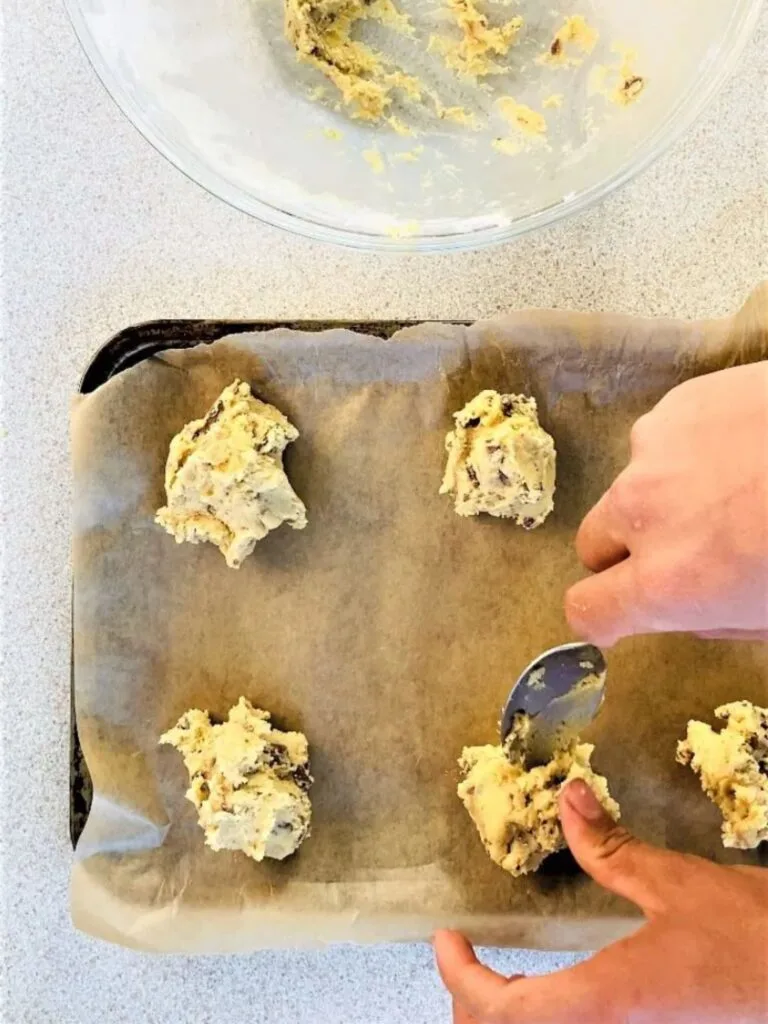 - Spoon the mixture into dollops on a lined cookie sheet/baking tray. I made fewer, larger cookies, so I used about 2 tbsps of mixture per cookie (remember they will spread).