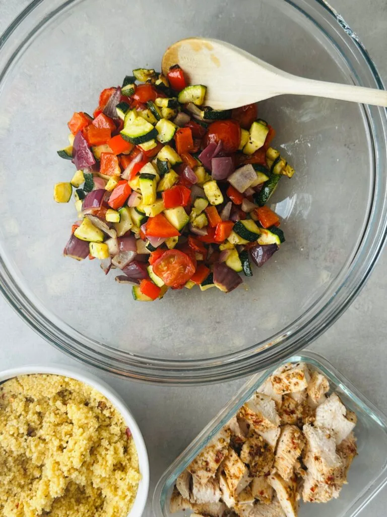 - Stir roasted veg through the couscous, stir through juice of half a lemon if using. Mix in sliced chicken and optionally drizzle over any sauce or dressing on serving.
