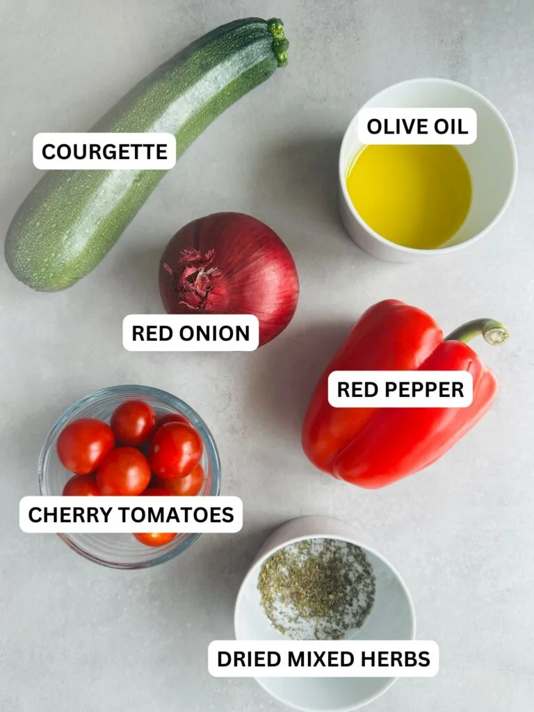 - Toss chopped courgette, red pepper, onion, and cherry tomatoes with olive oil, dried mixed herbs.