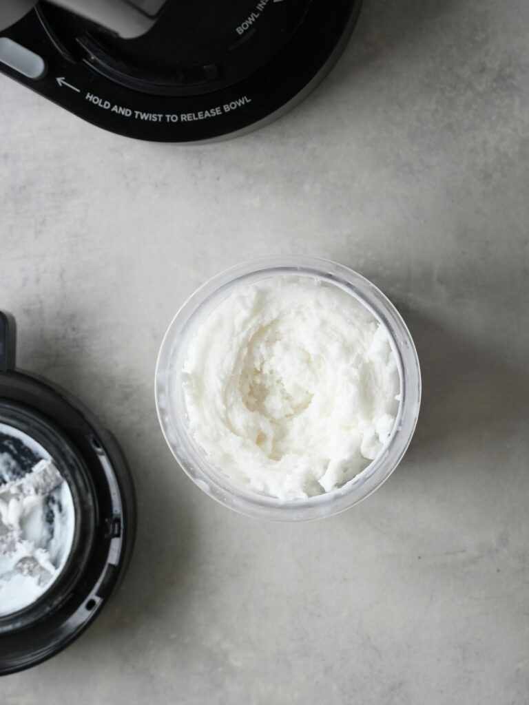 From here, follow the standard Ninja Creami process for ice cream (using the recommended setting from your machine). You may need to respin once or twice depending on the texture.