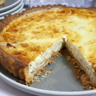 Quiche is a savoury tart filled with a savoury egg custard filling, including bacon and onions for a rich, creamy bite. The pastry case is shortcrust pastry, creating a delicious, flaky case for the filling.