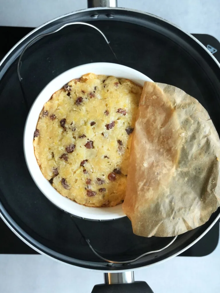 The pudding is ready when it gently springs back when pressed. Remove the baking paper and carefully lift the pot out of the saucepan (use oven gloves).