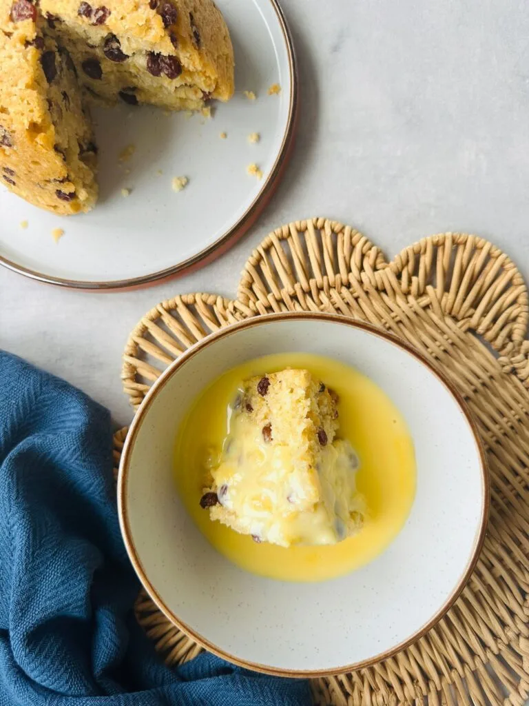 - Remove the pudding from the bowl and serve with warm custard or ice cream!