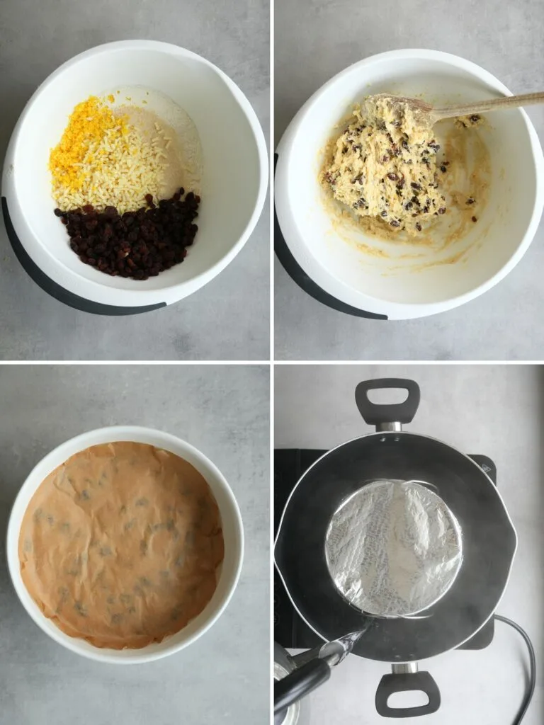 - Cover the bowl, or cylinder, in greaseproof paper, followed by foil over the top. If you are covering a cylinder allow enough space for the pudding to raise within the paper.